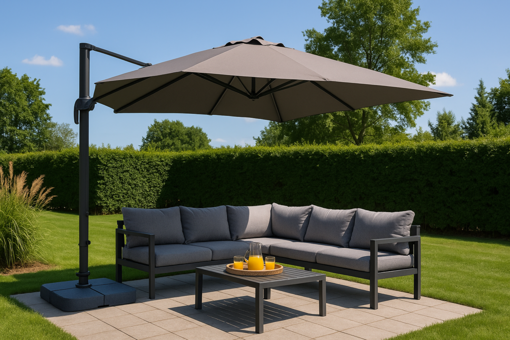 W praktyce stabilność parasola bocznego projektowanego do ogrodów rodzinnych można zwiększyć dzięki odpowiedniemu rozplanowaniu przestrzeni. Zwłaszcza wtedy, gdy pod nim znajduje się duży zestaw ogrodowy – np. narożnik wypoczynkowy rozbudowany o strefę stołową. Taka konfiguracja sprawdza się szczególnie dobrze przy meblach modułowych, jak w aranżacij z nowoczesnym zestawem mebli do ogrodu, który można przejrzeć w wersji rodzinnej na stronie zestaw mebli ogrodowych Loop I.